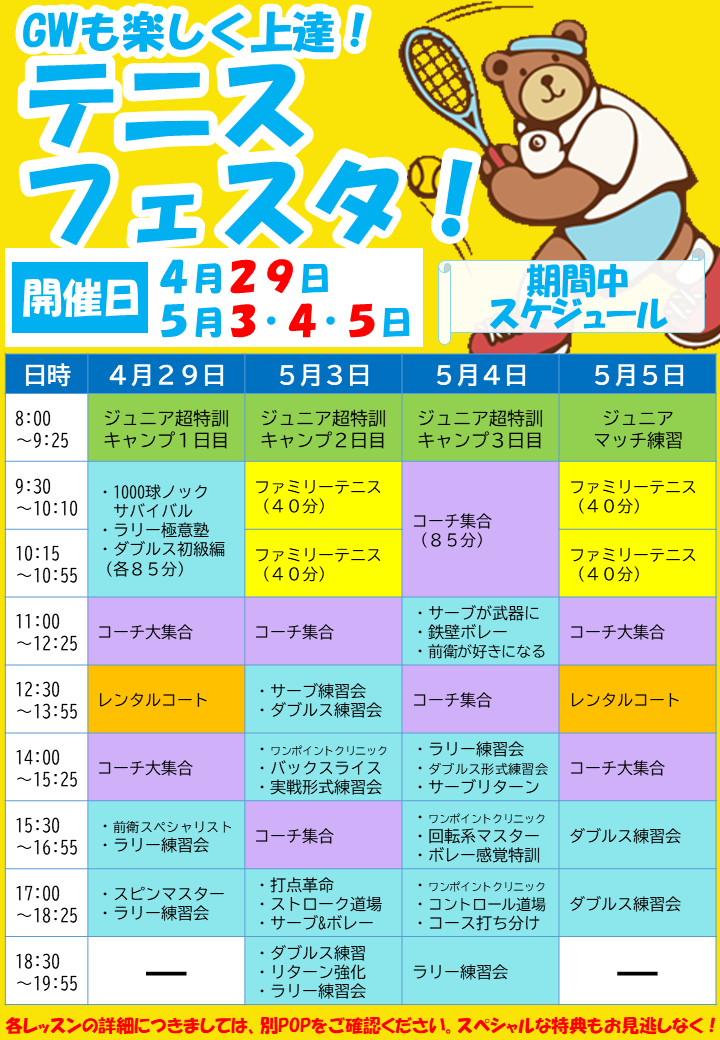 今年のゴールデンウィークは、4月29日(火・祝)、5月3日(土・祝)、4日(日・祝)、5日(月・祝)の4日間、通常レッスンをお休みして「テニスフェスタ」を開催します!